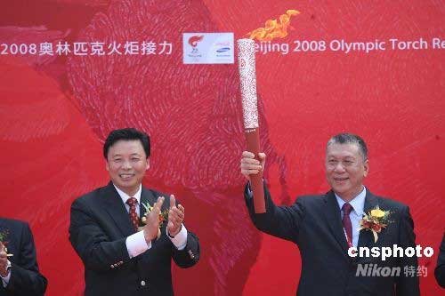圖為澳門特別行政區(qū)行政長(zhǎng)官何厚鏵(右) 、北京奧組委執(zhí)行副主席楊樹(shù)安等出席起跑儀式。中新社發(fā) 武仲林 攝