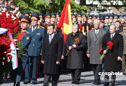 5月8日上午,俄羅斯新任總統(tǒng)梅德韋杰夫來到克里姆林宮西北側(cè)紅墻下的亞歷山大花園,向無名烈士墓敬獻(xiàn)花圈,紀(jì)念衛(wèi)國(guó)戰(zhàn)爭(zhēng)勝利63周年。俄前任總統(tǒng)普京、看守總理祖布科夫、議會(huì)兩院議長(zhǎng)米羅諾夫和格雷茲洛夫等高官政要參加了儀式。這是梅德韋杰夫就任總統(tǒng)后的首場(chǎng)正式活動(dòng)。中新社發(fā) 田冰 攝