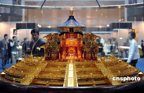 十月十四日,鑲有約20萬(wàn)粒寶石的“天壇祈年殿”工藝品引人注目。這件作品高1.38米,重2.5噸,以金銀、寶石等材料制成。當(dāng)日,中國(guó)傳統(tǒng)工藝美術(shù)精品大展在北京民族文化宮舉行,該展集中展現(xiàn)了改革開(kāi)放以來(lái)中國(guó)工藝美術(shù)三十年發(fā)展成就。中新社發(fā) 廖攀 攝