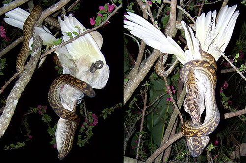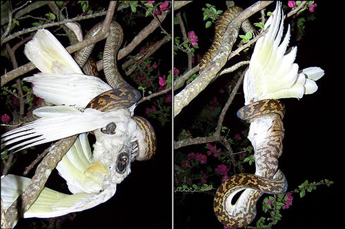 當(dāng)時(shí)這只美冠鸚鵡的主人正在家中工作,她聽到院子里傳來慘烈的叫聲,她意識(shí)到有些不妙立即跑出屋子,眼前的一幕立即讓她驚呆了:自己的鸚鵡已經(jīng)成為蟒蛇的“盤中餐”。“我當(dāng)時(shí)曾想跳起來去救鸚鵡,不過它已經(jīng)奄奄一息了。看到這一幕讓人非常難過!