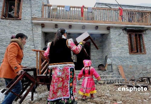 12月31日,四川地震極重災(zāi)區(qū)的北川縣一戶(hù)羌族災(zāi)區(qū)民眾,在2008年最后一天搬進(jìn)貓兒石新建的羌寨農(nóng)家。中新社發(fā) 賈國(guó)榮 攝