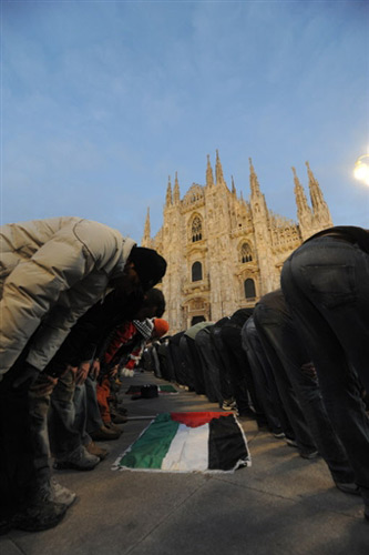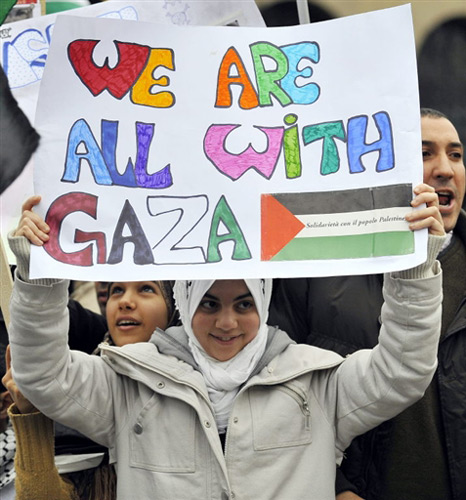 1月3日,在意大利米蘭,當?shù)厝罕娕e行集會活動,對在加沙地區(qū)遭空襲的巴勒斯坦死難者進行祈禱,抗議以色列襲擊加沙。