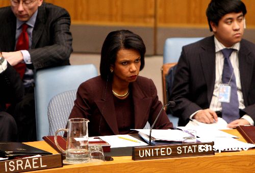 聯(lián)合國安理會(huì)一月六日晚就加沙局勢舉行緊急會(huì)議。美國國務(wù)卿賴斯出席會(huì)議。中新社發(fā) 李靜 攝