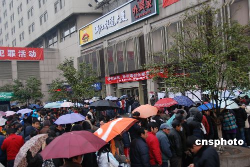 1月7日,在杭州城站火車站的售票大廳門前,排隊購票的人群異常擁擠。由于細(xì)雨綿綿的天氣,使得大廳外排起了雨傘購票的長龍。中新社發(fā) 張潔 攝