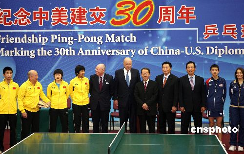 1月7日下午,“紀念中美建交30周年乒乓球友誼賽”在北京國家體育總局大廳舉行。中國外交部副部長王光亞與前來參加慶祝中美建交30周年活動的美國副國務卿內格羅蓬特一行觀看比賽。