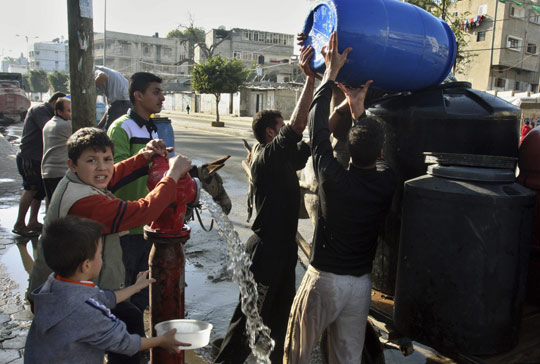 以色列軍方1月7日宣布,將從當(dāng)天開(kāi)始每天下午1點(diǎn)到4點(diǎn)停火3小時(shí),讓加沙地帶居民置備必需物品。圖為加沙居民在;鹌陂g抓緊補(bǔ)充用水。