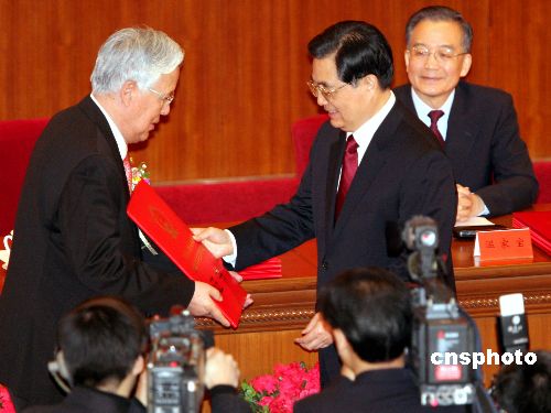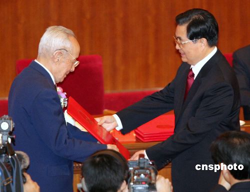 胡錦濤為徐光憲頒發(fā)國家最高科學(xué)技術(shù)獎(jiǎng)。中新社發(fā) 宋吉河 攝