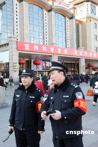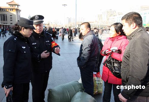 1月11日,2009年春運正式開始,北京警方啟動“服務(wù)旅客、平安春運”活動,為旅客發(fā)放安全提示卡,張貼海報介紹購票、乘車等出行注意事項,確保市民度過一個安全、快樂的春節(jié)。中新社發(fā) 任海霞 攝