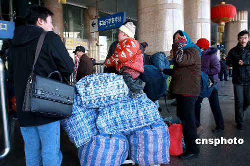 1月11日,為期40天的中國(guó)2009年春運(yùn)正式開始,春運(yùn)客流壓力依然很大,客流的剛性需求特征十分明顯,預(yù)計(jì)全國(guó)鐵路旅客發(fā)送量將達(dá)1.88億人,比去年同期增長(zhǎng)8%,日均470萬人,春運(yùn)“一票難求”的問題仍突出。圖為北京西站的客流不斷。