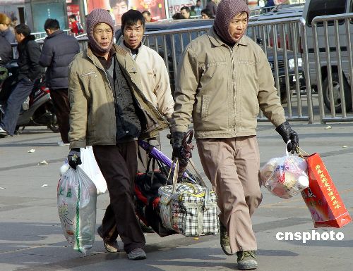三位農(nóng)民工剛從鄭州火車下車出站,準(zhǔn)備返鄉(xiāng)過春節(jié)。