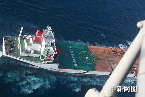 中新網(wǎng)1月14日電 中國(guó)海軍艦艇編隊(duì)正在亞丁灣海域執(zhí)行第二次護(hù)航任務(wù),為包括一艘臺(tái)灣商船在內(nèi)的四艘商船護(hù)航。圖為被護(hù)商船“振華十三”號(hào)在甲板上寫(xiě)著“向人民子弟兵致敬”幾個(gè)白色大字,向中國(guó)海軍護(hù)航官兵致敬、致謝,“海口”艦艦載直升機(jī)空中航拍時(shí)清晰可見(jiàn)。