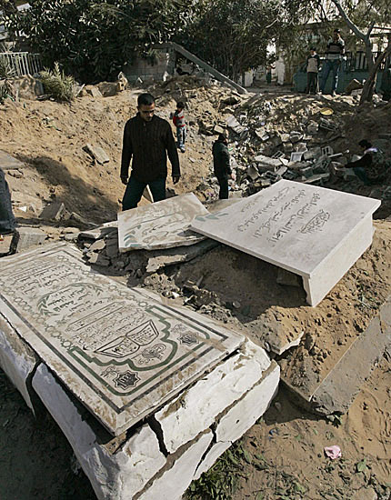 圖:加沙城一所公墓遭以軍戰(zhàn)機轟炸