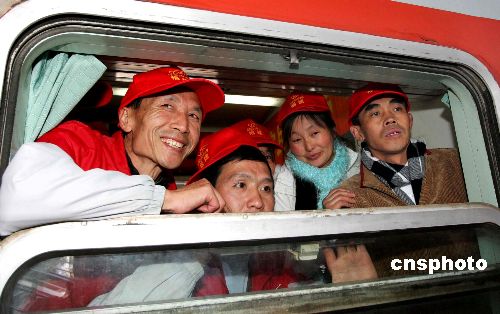 福建省首趟農(nóng)民工返鄉(xiāng)專列(福州—成都)1月15日11時38分啟程。在福建省總工會、中國移動福建公司、南昌鐵路局福州辦事處等多個部門的關(guān)心下,來自四川、陜西等地的650多名在閩務工人員,乘坐由福州開往成都的K392次列車踏上返鄉(xiāng)過年之旅。其中20名家在四川地震災區(qū)的農(nóng)民工還獲得免費車票。中新社發(fā) 楊婀娜 攝