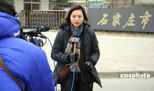 圖為當(dāng)日上午,在石家莊中級(jí)法院門(mén)口,來(lái)自香港的電視臺(tái)記者冒著寒風(fēng)做現(xiàn)場(chǎng)報(bào)道。中新社發(fā) 翟羽佳 攝