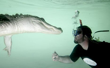 據(jù)英國媒體報道,1月22日,美國佛羅里達(dá)州邁阿密市叢林島動物園的員工西恩·曼寧(Sean Manning)不穿戴任何保護(hù)性衣物進(jìn)入鱷魚池“與鱷共舞”。