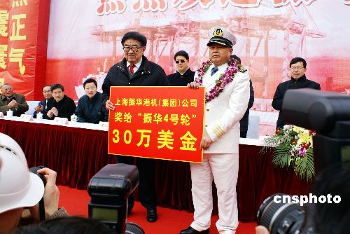 1月23日上午,上海振華港機集團在長興島基地為“振華4號”輪順利返航舉行盛大歡迎儀式,“振華4號”船長彭維源帶領(lǐng)29名船員整裝首次集體亮相,并向眾媒體記者和現(xiàn)場來賓介紹了抗擊索馬里海盜的具體經(jīng)過。歡迎儀式現(xiàn)場,振華港機集團向每位船員頒發(fā)1萬美元獎金,并授予船長“振華功臣金質(zhì)獎?wù)隆。北京時間2008年12月17日中午,中國交通建設(shè)集團所屬“振華4號”輪在途徑亞丁灣水域時遭遇2艘海盜船襲擊,有9名海盜登船,持沖鋒槍和火箭筒在甲板上與我船員對峙,我船上的30名船員用高壓水槍和自制燃燒彈自衛(wèi)并反擊。海盜在隨后趕來的國際救援軍艦直升機的威懾下,終于放棄攻擊,狼狽逃竄。中新社發(fā) 李根 攝