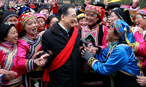 1月24日至25日,中共中央政治局常委、國(guó)務(wù)院總理溫家寶來到四川受災(zāi)最為嚴(yán)重的北川、德陽、汶川等地,和災(zāi)區(qū)人民一起過年。這是1月24日,溫家寶在北川縣擂鼓鎮(zhèn)貓兒石村看望羌族群眾。作者:姚大偉