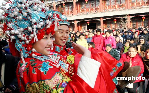 1月27日 (大年初二),北京大觀園十四屆紅樓廟會(huì)吸引眾多假日游客,本屆廟會(huì)以弘揚(yáng)中華傳統(tǒng)文化為宗旨,以展現(xiàn)紅樓文化為主題,呈現(xiàn)出改革開(kāi)放30年來(lái)新北京、新宣武的精神風(fēng)貌。廟會(huì)主要活動(dòng)有“元妃省親”、“寶黛成婚”“賈母賀壽”、紅樓文化展覽--木版年畫展、紅樓夢(mèng)人物火花展以及紅樓美食展示區(qū)等。圖為在北京大觀園2009年紅樓廟會(huì)上別具創(chuàng)意的“寶黛成婚”。中新社發(fā) 錢興強(qiáng) 攝