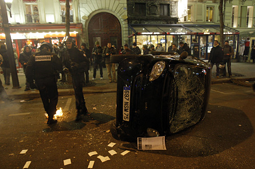 中新網(wǎng)1月30日電 法國(guó)全國(guó)有逾百萬(wàn)人在29日罷工,抗議總統(tǒng)薩科齊處理金融危機(jī)的手法未能令工人受惠。在巴黎,示威演變成騷亂,示威者在商業(yè)大街?jǐn)S玻璃樽和放火,更與警方爆發(fā)推撞,警方施放催淚氣體驅(qū)散群眾。