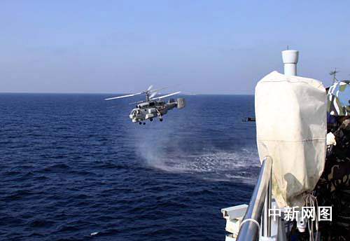 中新網(wǎng)“?凇迸瀬喍1月31日電 當(dāng)?shù)貢r(shí)間1月29日上午,中國(guó)海軍護(hù)航編隊(duì)“?凇碧(hào)導(dǎo)彈驅(qū)逐艦數(shù)名特戰(zhàn)隊(duì)員由艦載直升機(jī)滑降到被護(hù)香港“鵬程”號(hào)商船上,執(zhí)行“海口”艦第一次實(shí)施的隨船護(hù)衛(wèi)行動(dòng)。圖為直升機(jī)從“?凇迸炂痫w奔赴被護(hù)香港商船。