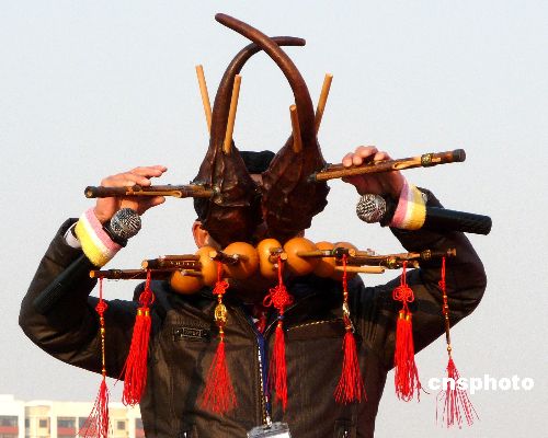 同時(shí)演奏九個(gè)葫蘆絲。中新社發(fā) 玉龍 攝