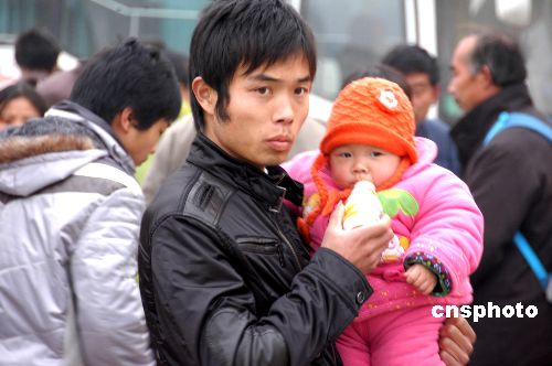 2009年2月1日,在河南新蔡縣汽車站內(nèi),農(nóng)民工們又踏上了外出“淘金”路。春節(jié)剛過,他們就滿懷著夢想和憧憬,早早地踏上外出打工的征程,希望牛年能夠給自己帶來好運氣。中新社發(fā) 趙學(xué)風(fēng) 攝