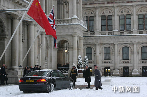 倫敦當(dāng)?shù)貢r(shí)間二月二日上午八時(shí)三十分許,正在這里進(jìn)行正式訪問(wèn)的中國(guó)總理溫家寶前往英國(guó)外交部,出席布朗首相舉行的歡迎儀式。圖為溫家寶座車駛向觀禮臺(tái),英國(guó)首相布朗(右二)在車旁迎接。 中新社記者 張朔 攝