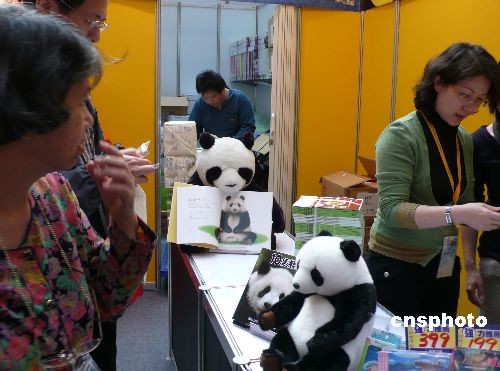 圖為大陸贈(zèng)臺(tái)大熊貓“團(tuán)團(tuán)”“圓圓”到臺(tái)灣后,熊貓形象成為本屆書展新寵,畫冊、玩偶、游戲等展品琳瑯滿目。中新社發(fā) 路梅 攝