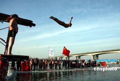 2月8日,在哈爾濱松花江公路大橋西側(cè)的黑龍江省冬泳協(xié)會(huì)浴場(chǎng)內(nèi),國(guó)內(nèi)外游客正在觀(guān)看冬泳健兒的冬泳表演。當(dāng)日正值哈爾濱第24屆國(guó)際大學(xué)生冬季運(yùn)動(dòng)會(huì)倒計(jì)時(shí)10天。
