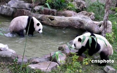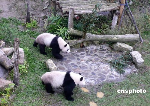 圖為“團(tuán)團(tuán)”“圓圓”在戶外展場(chǎng)閑庭信步。中新社發(fā) 路梅 攝