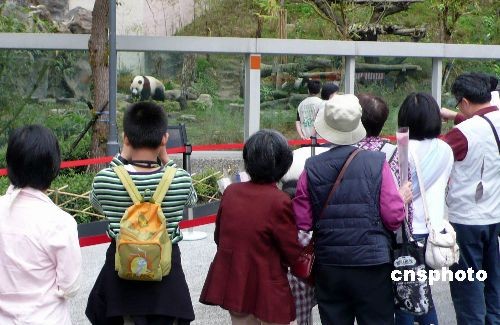 圖為觀眾排隊(duì)依次參觀在戶外活動(dòng)的大熊貓。中新社發(fā) 路梅 攝