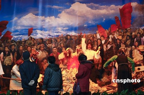 2月24日,“西藏民主改革50年大型展覽”在北京民族文化宮開(kāi)幕。展覽分為和平解放西藏,平息武裝叛亂,西藏的民主改革,50年來(lái)統(tǒng)一與分裂、進(jìn)步與倒退的斗爭(zhēng),經(jīng)濟(jì)社會(huì)發(fā)展和人權(quán)事業(yè)的巨大成就等5部分,包含500多幅圖片和180多件實(shí)物、文獻(xiàn)檔案。展覽將持續(xù)一個(gè)半月。展覽再現(xiàn)獲得解放的農(nóng)奴焚燒契書的場(chǎng)景,吸引不少觀眾。中新社發(fā) 盛佳鵬 攝