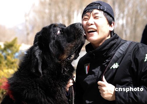 2009年初春,中新社特派記者一行到西藏藏獒協(xié)會(huì)養(yǎng)殖基地采訪,《中國(guó)新聞周刊》記者劉震被喜馬拉雅河谷型藏獒口水四濺地?zé)嵛,逗得大家啼笑皆非。中新社發(fā) 廖攀 攝