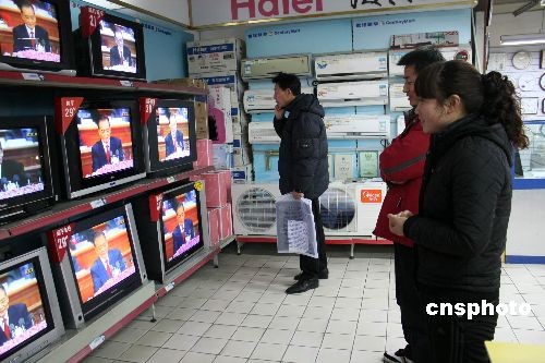 2009年3月5日上午,江蘇省大豐市一家超市家電部,顧客在收看溫家寶總理作政府工作報告。中新社發(fā) 周古凱 攝