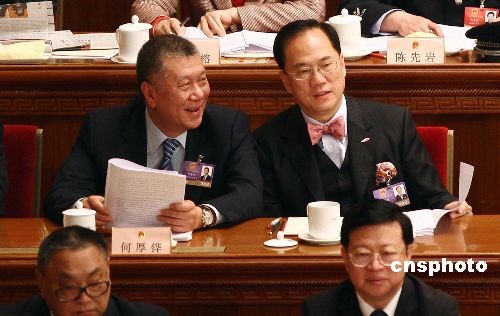 3月5日上午,十一屆全國(guó)人大二次會(huì)議在北京人民大會(huì)堂開幕。香港特別行政區(qū)行政長(zhǎng)官曾蔭權(quán)、澳門特別行政區(qū)行政長(zhǎng)官何厚鏵列席會(huì)議并在主席臺(tái)就座。中新社發(fā) 杜洋 攝