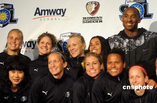 NBA著名球星科比·布萊恩特在洛杉磯歡迎加盟洛杉磯太陽隊(美國女子足球職業(yè)聯(lián)盟球隊)的巴西球星瑪塔(后排右二)、中國球員韓端(前左一)等外籍球員,并與太陽隊隊員合影。中新社發(fā) 張煒 攝