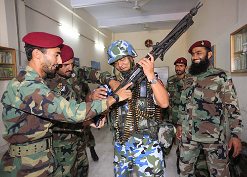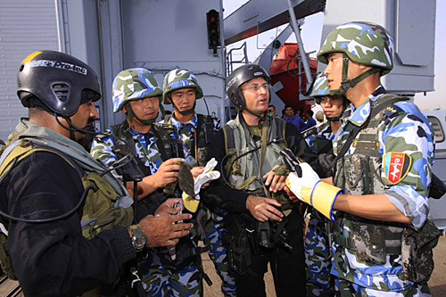 中國(guó)海軍特戰(zhàn)隊(duì)員(中)參加“和平—09”多國(guó)海上聯(lián)合軍演時(shí)與巴基斯坦海軍特戰(zhàn)隊(duì)員交流。
