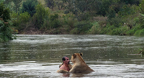 圖:人與母獅一同在河中洗澡(4)——中新網(wǎng)