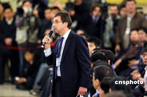 3月13日,十一屆全國(guó)人大二次會(huì)議閉幕后,國(guó)務(wù)院總理溫家寶在北京人民大會(huì)堂與中外記者見面。美國(guó)《華爾街日?qǐng)?bào)》記者就中國(guó)分散投資風(fēng)險(xiǎn)的策略、能否保證中國(guó)不會(huì)讓人民幣貶值、中國(guó)會(huì)不會(huì)向國(guó)際貨幣基金組織提供資金支持,向溫總理提出三問。中新社發(fā) 傅丹丹 攝