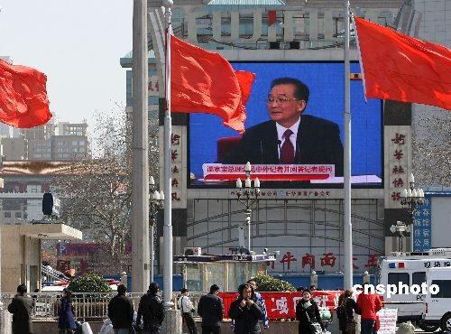 2009年3月13日,國務院總理溫家寶在人民大會堂與采訪全國兩會的中外記者見面,北京站站前大屏幕對此進行實況轉播,吸引往來旅客的關注。中新社發(fā) 魯谷 攝