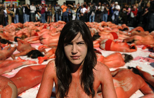 圖:動(dòng)物保護(hù)組織成員裸身抗議捕獵海豹——中新網(wǎng)