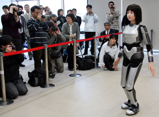 日本科學(xué)家最近展示了一名機(jī)械黑發(fā)美女,她不僅能說話,可行走具有豐富的表情,還能在舞臺(tái)上走貓步。這個(gè)外表亮麗的類人機(jī)器人名為“HRP-4C”,它的體內(nèi)裝有30個(gè)發(fā)動(dòng)機(jī),能夠幫助它行走和移動(dòng)手臂,面部的8個(gè)發(fā)動(dòng)機(jī)則賦予它憤怒、驚訝等表情。