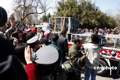3月22日,在京生活了9個(gè)月的8只奧運(yùn)大熊貓開始起程返回四川老家,北京動(dòng)物園特地舉辦了“奧運(yùn)熊貓返川儀式”,吸引萬名觀眾前來依依惜別。中新社發(fā) 鄭雄增 攝