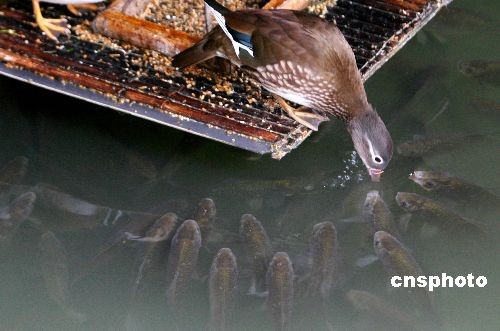 3月23日,蘇州拙政園池塘內(nèi)的鴛鴦給水中魚(yú)兒“喂”食。自08年秋季蘇州拙政園飼養(yǎng)在“卅六鴛鴦館”景點(diǎn)池塘內(nèi)上演了“鴛鴦喂魚(yú)”后,曾一度被人們傳為自然界動(dòng)物親情的美談與佳話。時(shí)下,隨著今年春來(lái)水暖,該池塘里的鴛鴦們又開(kāi)始充當(dāng)“愛(ài)心魚(yú)媽媽”,并爭(zhēng)相給成群結(jié)隊(duì)浮出水面的小魚(yú)兒“施舍”喂食,吸引了不少游客駐足觀看。中新社發(fā) 王建中 攝