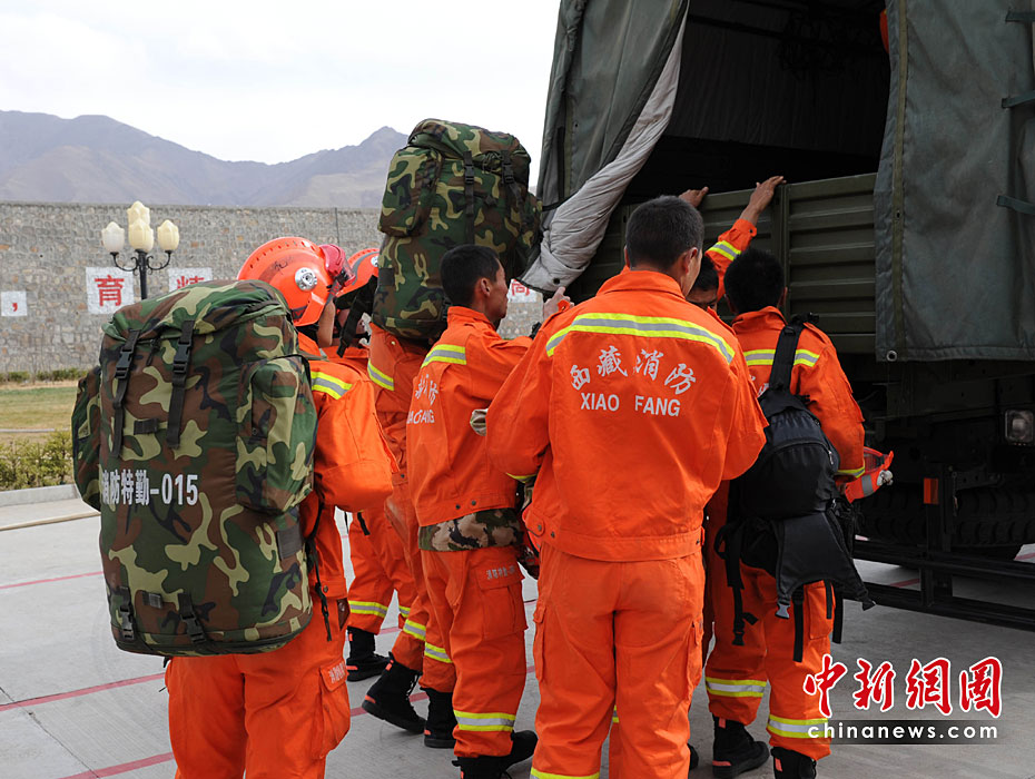 圖為4月14日下午17時50分,西藏消防總隊并西藏自治區(qū)地震災害緊急救援總隊派出直屬特勤大隊30名官兵、3輛救援跨區(qū)域遠距離增援玉樹地震災區(qū)。中新社發(fā) 陶盛楷 攝