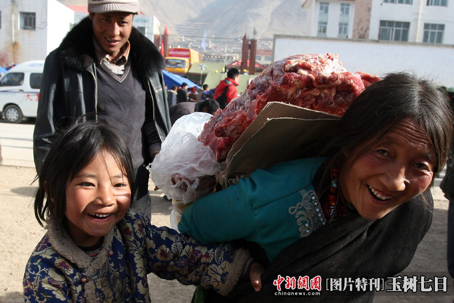 4月18日,青海玉樹體育場(chǎng)受災(zāi)民眾安置點(diǎn)內(nèi),得到副食品的祖孫倆笑容滿面。中新社發(fā) 盛佳鵬 攝