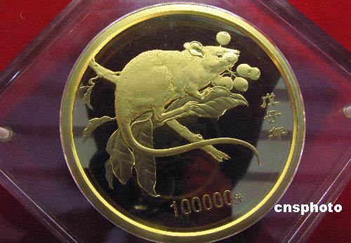 10月26日,由中國(guó)金幣總公司等單位主辦的“2007北京國(guó)際錢幣博覽會(huì)”在北京中國(guó)國(guó)際貿(mào)易中心開幕。博覽會(huì)展出了中國(guó)人民銀行于2007年10月23日發(fā)行的2008中國(guó)戊子(鼠)年金銀紀(jì)念幣一套。其中10公斤(鼠)圓形金質(zhì)紀(jì)念幣,含純金10公斤,直徑180毫米,面額100000元,成色99.9%,最大發(fā)行量?jī)H僅18枚。據(jù)介紹,這枚10公斤金幣售價(jià)遠(yuǎn)遠(yuǎn)高于面值。中新社發(fā) 鄒憲 攝
