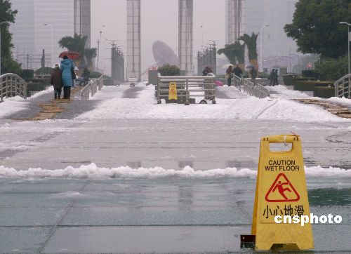 1月28日,上海城鄉(xiāng)大雪紛飛,上海氣象臺(tái)再次發(fā)布道路結(jié)冰警報(bào)。圖為提醒路人防滑的警示牌在上海的公共場(chǎng)所隨處可見。中新社發(fā) 個(gè)路 攝
