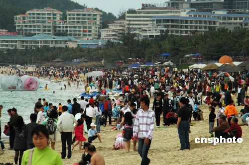 圖為三亞大東海景區(qū)沙灘上休閑的游客。