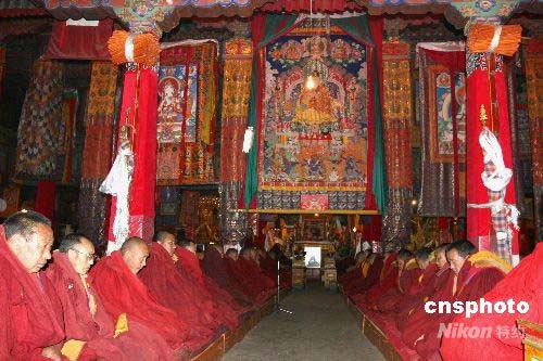 四月三十日,北京奧運會倒計時一百天,藏傳佛教格魯派三大寺廟之一的拉薩色拉寺三百五十多名僧人,舉行“祈愿世界和平,祝愿北京奧運會圓滿成功”祈愿法會。中新社發(fā) 柳俊武 攝